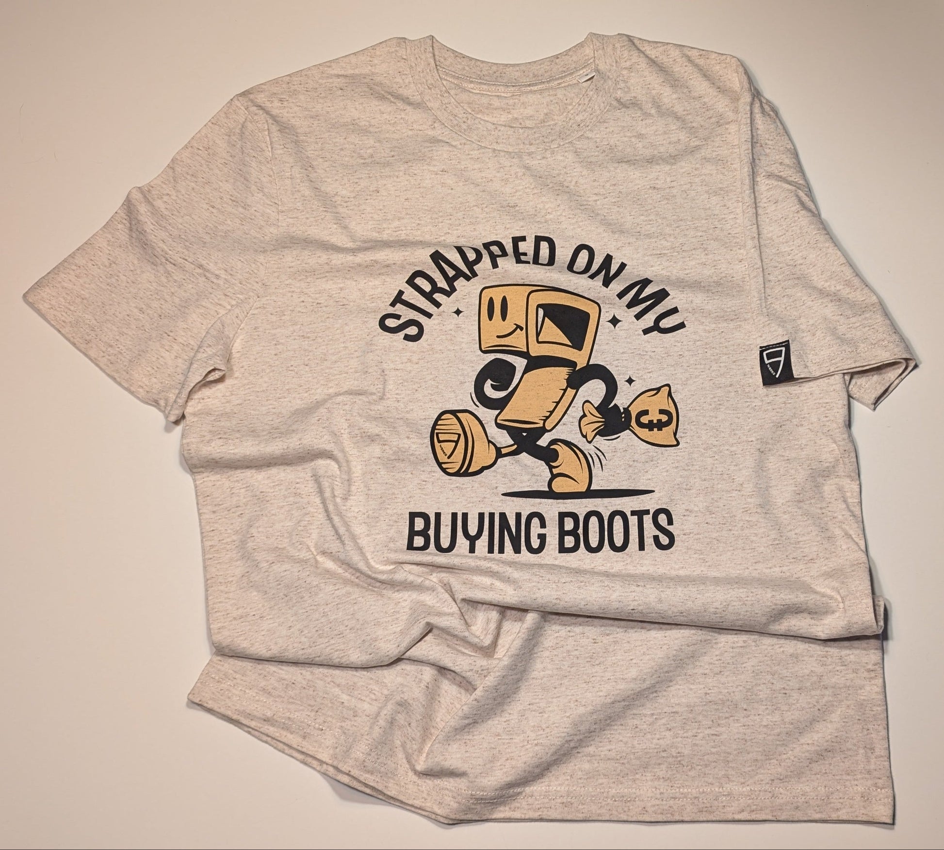 The 'Buying Boots' t-Shirt has the logo on the front along with the subtile 9WERKS logo on the sleeve. The T-Shirt is 180G/M2 100% organic ring-spun combed cotton.